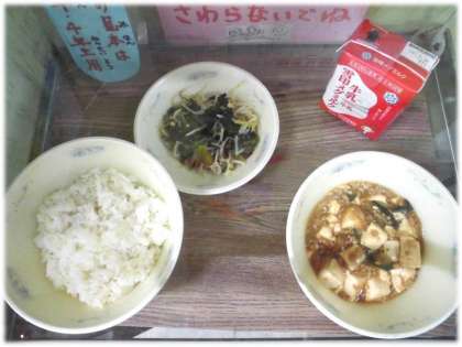 今日の給食は麦ごはん,牛乳,マーボどうふ,ほうれん草ともやしのいためナムルです。