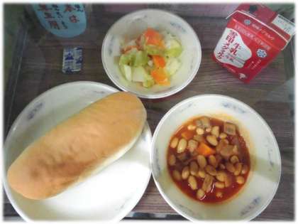 今日の給食は,コッペパン,牛乳,ポークビーンズ,野菜のホットマリネ,チーズです。