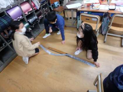 1メートルのものさしと30センチメートルのものさしを駆使して紙テープの長さをはかりました。
