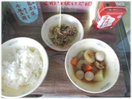 今日の給食はごはん,牛乳,関東煮,もやしと小松菜のごまいためです。