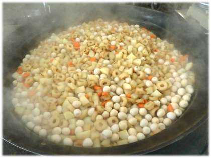 「関東煮」は,おでんともよばれ,日本各地で食べられていますが,地域によって味つけや具がさまざまです。今日の関東煮は,こんぶとけずりぶしでとっただしで煮込んで,さとう,しょうゆ,みりんで味つけをしました。一段と寒くなった日に嬉しい献立です。みんな給食を楽しみにしていたようで,どのクラスもしっかり食べていました。
