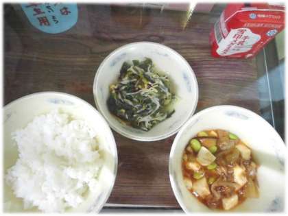 今日の給食はごはん,牛乳,とうふの四川風,ほうれん草ともやしのいためナムルです。