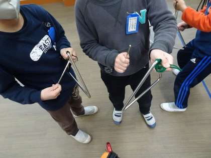 トライアングルが,たたくところや持ち方によって少し音が違うことなどを子どもたちは発見しました。