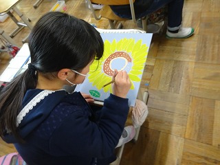 一版多色刷りの版画もいよいよ仕上げに入ってきました。自分だけの植物の版画を作っています。一度できた作品を見直して,色を塗り重ねる活動をしています。
