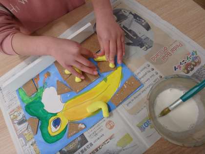 思い思いの形にした木の板をメッセージボードにするために薄いコルクをつけました。