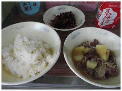 今日の給食は麦ごはん,牛乳,肉じゃが,ひじきの煮つけです。