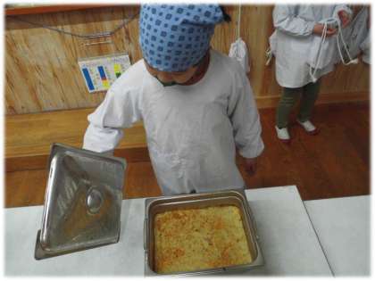 今日の給食はミルクコッペパン,牛乳,ペンネの豆乳グラタン,野菜のスープ煮です。ペンネの豆乳グラタンは,スチームコンベクションオーブンを使って作りました。焼き目がきれいにつき,おいしそうに仕上がり,とても喜んでくれていました。みんな楽しみにしていたようで,どのクラスもしっかり食べきっていました。