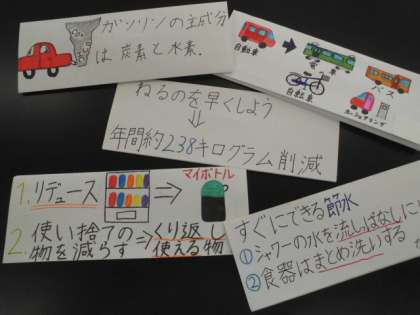 理科「私たちの生活と地球環境」では,水・空気・生物の観点から,どんな環境問題があるのか調べました。その中から,さらに関心をもったことを選び,ひとりひとりが原因や対策について勉強しました。