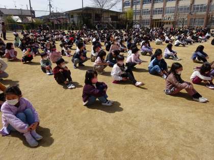 中間休みだったので,運動場や教室,中庭など様々な場所にいた子どもたちでしたが,どの場所にいた子も自分の身を守るための行動をとっていました。