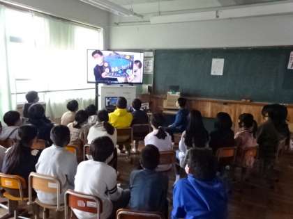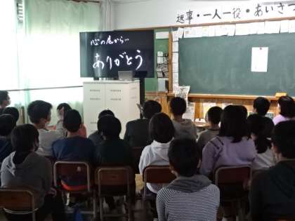 エンディングムービーでは,教職員や全校児童からのメッセージを流しました。涙涙の動画で,6年生は食い入るように見ていました。