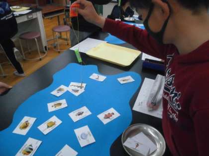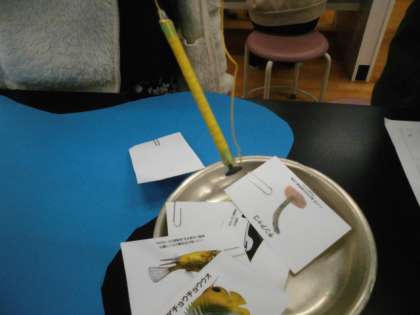 スイッチオンで磁石になり,クリップがつく仕掛けを使って,魚釣り大会をしました。リサイクル工場でスチール缶だけをくっつけ,クレーンで移動させる仕組みと同じだと体感。