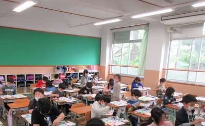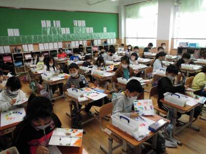 3年生の最初の図画工作科は絵の具の学習でした。筆洗やパレットの使い方を確認したり,黄色に青色を混ぜると緑色ができるなど混色について学習したりしました。混ぜる量によって色に違いが出てくることにも気付いていました。