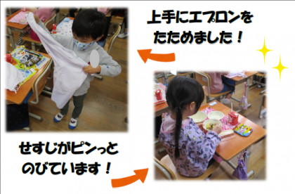 エプロンの着方やたたみ方など,苦戦している人には,先週に当番をしたにんじんチームの人がやさしく教えてあげている姿も見られました。