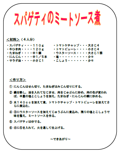 ご家庭で主食として作る際は,分量を倍にしたり,ソースをスパゲティの上にかけて盛り付けるなどされてもよいと思います。