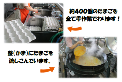 「親子煮」に使った卵はなんと,約400個!それを調理員さんが1人ですべて手作業で割ってくださいました!卵を割るときは,ひとつひとつ小さなおわんに割り入れ,殻(から)が入っていないかを丁寧に確認します。混ぜるときは,おうちの時みたいに「おはし」で混ぜるのではなく,大きな「泡立て器」を使います。初めて給食室での調理の様子を見た1年生は,