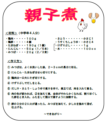 「親子煮」は,給食の定番献立のひとつです。