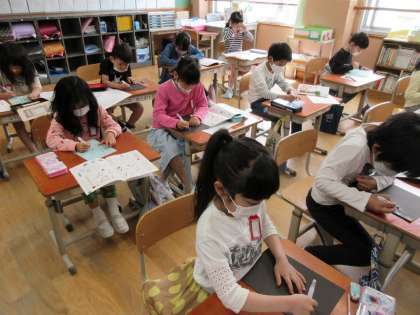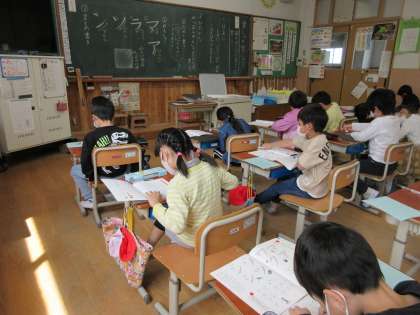 はじめに教科書を開いて,文字を書くときの姿勢や鉛筆の持ち方を確認しました。
