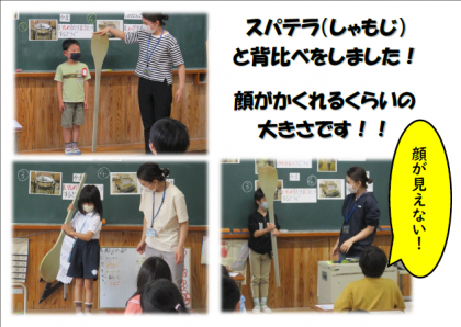 答え合わせをした後に,給食室で実際に使用している「スパテラ」と呼ばれる大きなしゃもじも登場しました!横に並んで背比べをしてみたり,実際に持ってかき混ぜる動作をしてみたり…。子どもたちは,スパテラの大きさを目の当たりにしたと同時に,給食調理員さんの苦労を改めて実感したようです。