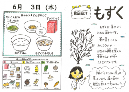 今日のみそ汁には,海藻(かいそう)のもずくを使用しました。もずくは春によくとれる海藻です。骨や歯をつくるカルシウムや,おなかの調子を整える食物繊維が多くふくまれています。