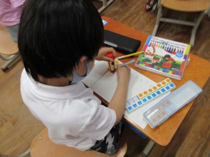 お道具箱の中のスティックのりやクレヨンの箱などを見つけて,一生懸命に形どりをしていました。