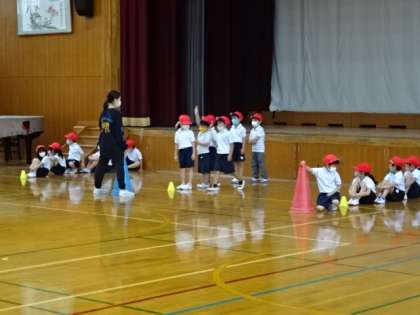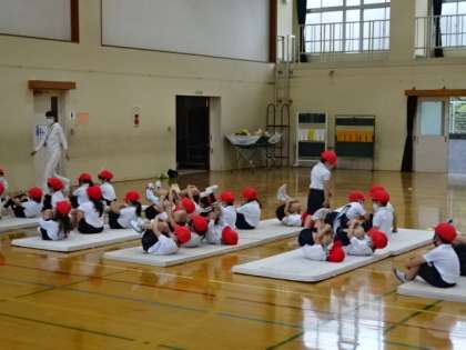 「マット遊び」ではゆりかごなど基礎練習を,「リレー遊び」ではグループに分かれて一生懸命走っていました。