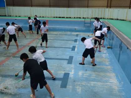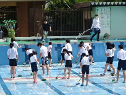 昨年度はコロナの影響でプール学習が実施できなかったので,どれだけ汚れがたまっているのか不安な部分もありました。最初は泥や汚れがひどかったプールも,6年生の力でピカピカに。緊急事態宣言が明けたら水泳学習を始める予定をしています。他学年の子どもたちもきれいになったプールを見て,プール学習を待ち遠しそうにしていました。