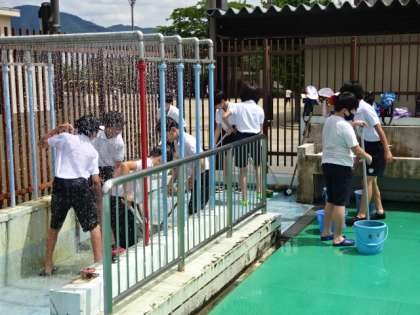 6月11日(金)に6年生はプール掃除を行いました。天気にも恵まれ,水の中に入ったり,水を浴びたりすることが気持ちよく,子どもたちは一生懸命に,そして楽しそうに取り組みました。