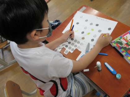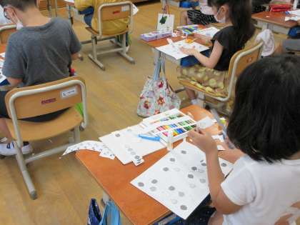 今週はフルーツや動物のカードを切り貼りして「いくつかなクイズポスター」を作りました。