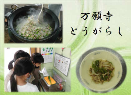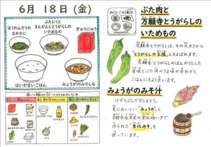 「その土地でとれたものを,その土地で食べること」を,『地産地消』といいます。今日の給食では,「万願寺とうがらし」と,みょうがのみそ汁に使用した「京北みそ」が地産地消の食べ物です。