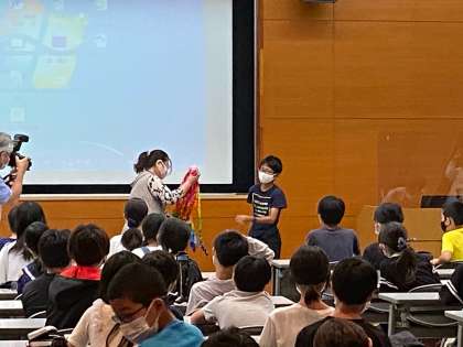 まずは当時の様子を知る語り部さんのお話を聞きました。当時のリアルな話を子どもたちは真剣に聞き入っていました。最後にはみんなで折った千羽鶴を渡し,鎮魂と感謝の思いを伝えました。