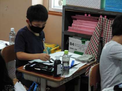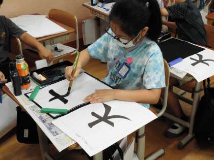 書写の時間に「大」を習字で書きました。「左はらい」と「右のはらい」の力の加減に気を付けながら書きまし。