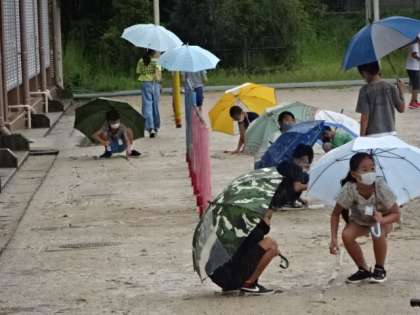 理科では,「雨水のゆくえ」の学習で,ちょうど雨だったので,水がどのように流れているのか運動場で確認していました。