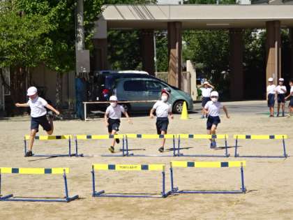 体育は「ハードル走」です。「上へ」ではなく「前へ」を意識しながらリズムよくハードルを越えられるよう練習していました。