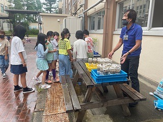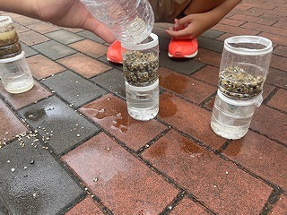 3種類の砂をペットボトルへ入れて,水を入れてみました。