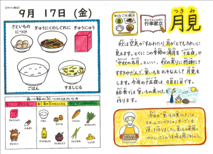今日は,月に一度の和(なごみ)献立の日です。月見にちなんだ「里いもの煮つけ」が登場しました。今年の月見(十五夜)は,9月21日(火)です。この日は,「中秋の名月」といい,月がとてもきれいに見えます。
