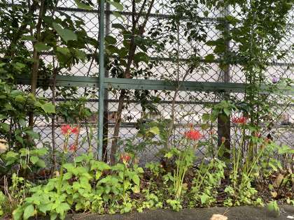 学校の横に赤い花がきれいに咲いています。