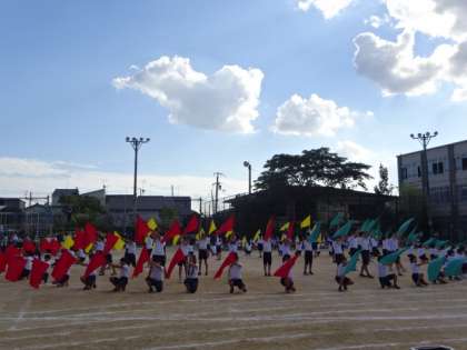 「フラッグダンス」では,一つ一つの仕草だけでなく,旗を振る音が揃っているのがとてもカッコよく,見ごたえのある演技でした。また,2年生だけでなく,4・5年生も校舎から6年生の演技を見てくれ,鏡山の6年生らしい姿を多くの下級生に見せてくれました。6年生の真剣な姿は多くの人の心に響くもので,演技終了後の多くの拍手と観客や教職員の涙がそれを物語っていました。