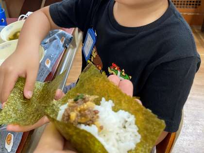 のりの上にご飯と一緒に肉みそ納豆を乗せて食べました。