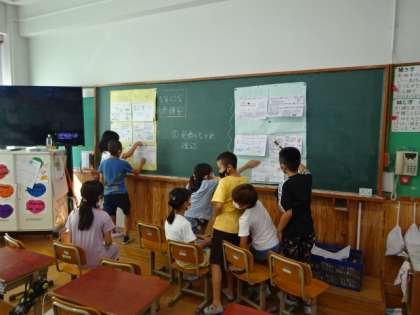 未来創造学習では,環境について調べたことの発表会に向けて,効果的な発表の仕方を考えながら班で練習していました。