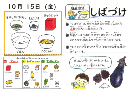 「しば漬」は,京都の三大漬物のひとつです。給食のしば漬は,京都産のなすと,左京区の大原で作られた赤じそ,塩のみを使い,昔ながらの方法で乳酸発酵させて作られています。