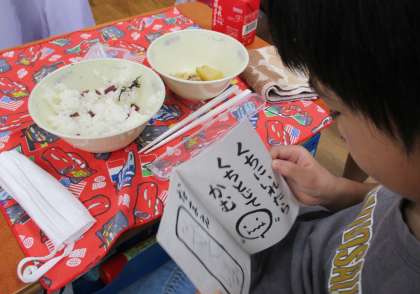 独特のすっぱさを苦手とする子がいる一方で,しば漬が登場する日を先月からずっと楽しみにしている子もいました。1年生の中には,初めて食べた子もいたようですが,
