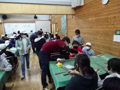 6年生はまずはクラフトで,「小枝温度計」を作りました。小枝をやすりで削って,そこに温度計や目玉をつけていきます。オリジナルのかわいい温度計が仕上がりました。