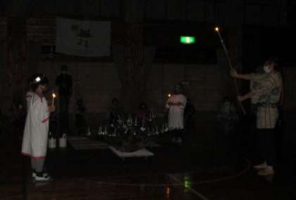 夜に予定していたキャンプファイヤーは,天候の都合により「キャンドルファイヤー」に変更して実施しました。火の子が火の神から火をもらい,点火しました。