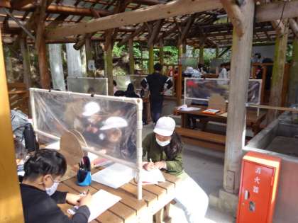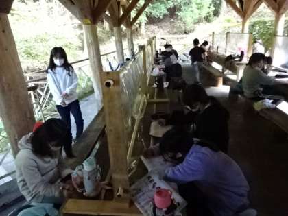 野外炊事の後片付けが早く終わった6年生は,2日間の振り返りをしました。静かに集中してじっくりと自分たちの行動を振り返っていました。