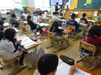 図書はもうすぐ読書週間。担任の先生の読み聞かせを集中して聞いていました。