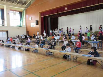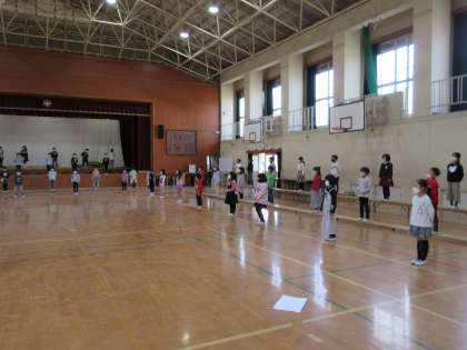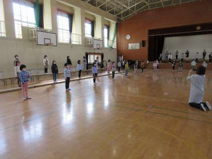 感染防止対策を考え,児童同士の距離をとりながら録画を行いました。