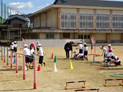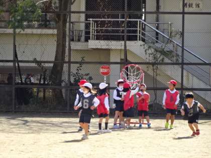 体育は,「まねっこ遊び」と「パスゲーム」をしていました。前の人に合わせて動きをまねたり,相手の取りやすいボールを投げてパスをつなぎゴールを目指したりしていました。