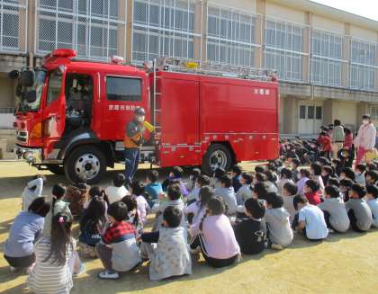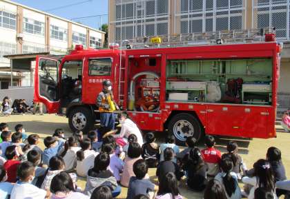 避難訓練後,1〜3年生とたいよう学級は消防車を見学させてもらいました。消防車は見たことがあっても,中がどうなっているのかを知っている子は少ないようで,子どもたちは興味津々で見ていました。