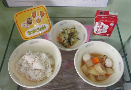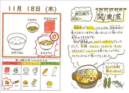 おでんのことを,関西では「関東煮」ともいいます。給食でこの献立が登場すると,「今年も冬がやって来たなぁ〜」という気持ちになりますね。だしの味がきいたやさしい味つけで,心も体もほっこりしました。