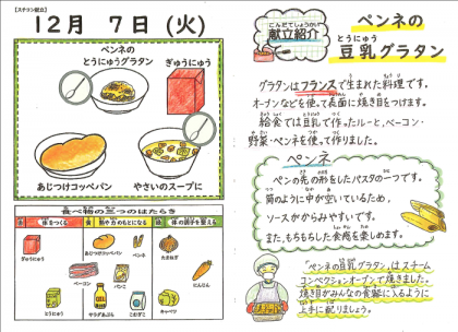 ★「今日の給食は全部おいしかったです。特にぼくがおいしかったのは,『ペンネの豆乳グラタン』です。シャキシャキしている部分,カリカリしている部分,ふわふわしている部分の3つが組み合わさり,最高のバランスでした。」